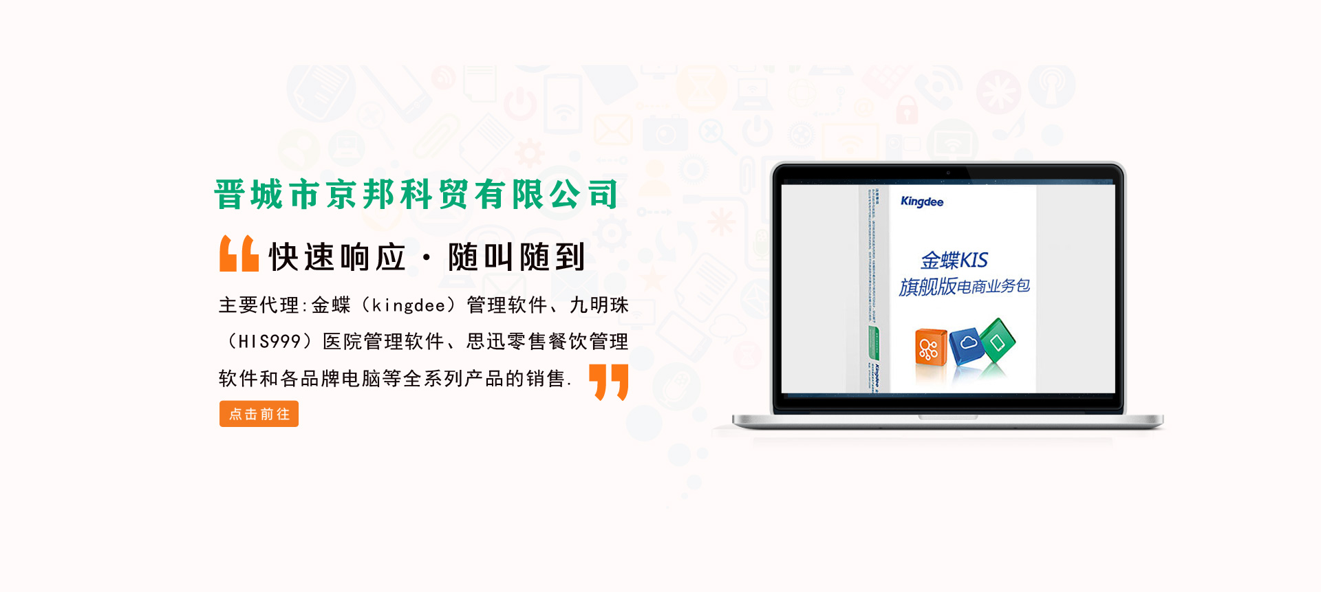 晉城市京邦科貿有限公司成立于2006年,是經晉城市工商行政管理局登記注冊,主要從事軟件銷售、電腦銷售和企業(yè)管理咨詢等相關業(yè)務,是金蝶軟件(中國)有限公司、深圳九明珠信息科技有限公司、深圳萬國思迅軟件有限公司在晉城地區(qū)高級代理商,主要代理金蝶(kingdee)管理軟件、九明珠(HIS999)醫(yī)院管理軟件、思迅零售餐飲管理軟件和各品牌電腦等全系列產品的銷售。